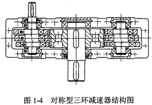 尽管我国在三环减速器的研究方面取得了许多令人瞩目的成果,但由于三环减速器的研发时间较短,对有些问题研究的还不够深入,生产中存在的一些实际问题还未从根本上得到解决,制约了这种新装置的推广使用。我国开发的三环减速器的基本型结构主要有两种,一是两高速轴对称布置于输出轴两侧的对称型三环减速器,如图1-4所示,另一种是两高速轴布置于输出轴同侧的偏置型三环减速器。