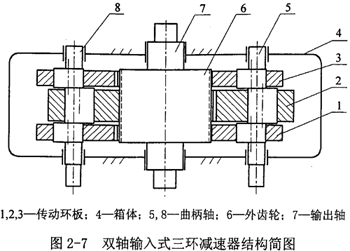 完全平衡双轴输入式三环式减速器如图2-7所示。其工作原理为:三环式减速器的曲柄轴在动力的驱动下同步旋转,传动环板上的内齿圈与输出轴上的外齿轮相互啮合,形成了大传动比,从而实现了减速及动力传递。双轴同步输入可以克服传动机构的死点问题。