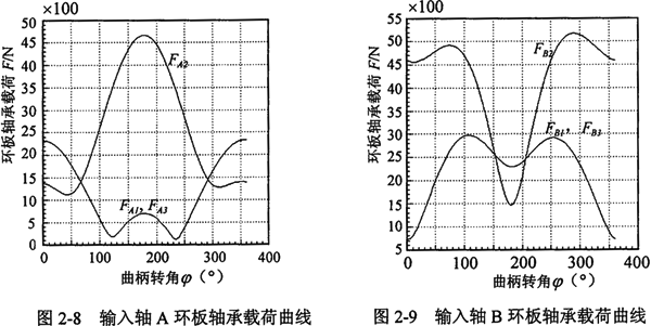 由环板轴承的受力曲线可看出,两输入轴环板轴承受力是不同的,其最大值也略有差别。
