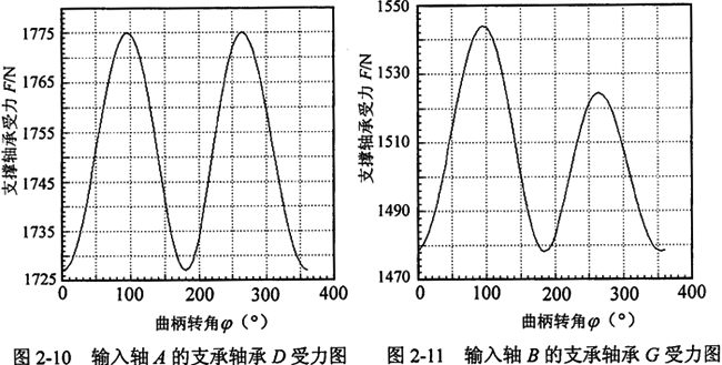 将上述方程中的A和D′换成B和G′,便得到了另一根曲柄轴的力和力矩方程。进而得到另一曲柄轴的支撑轴承的受力。