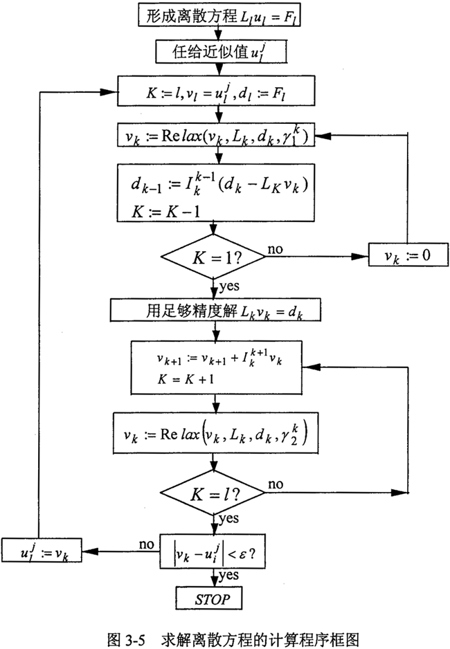 图3-5所示为l个网格层上利用V循环求解离散方程(3-31)式计算框图。
