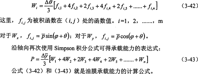 若液体压力以解析表达式给出,油膜浮动的承载能力可由3-10和3-11式直接积分求得。但由于本节方法求出的压力是离散值,其承载能力需用数值积分求解。本文通过采用Simpson 积分公式的方法,分别沿周向和轴向迭加求值。