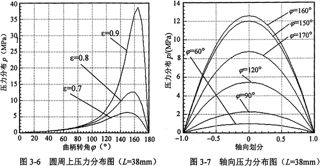 由图3-7可看出,油膜浮动时的压力沿轴向近似成抛物线形状,但在不同的角度下其值则是不同的。