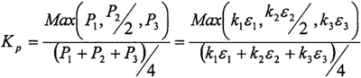 试验中选用的电阻应变片长度为0.2mm,电阻为119.8±0.2Ω,相差很小,即k1、k2/2、k3彼此差别很小,所以上式简化为: