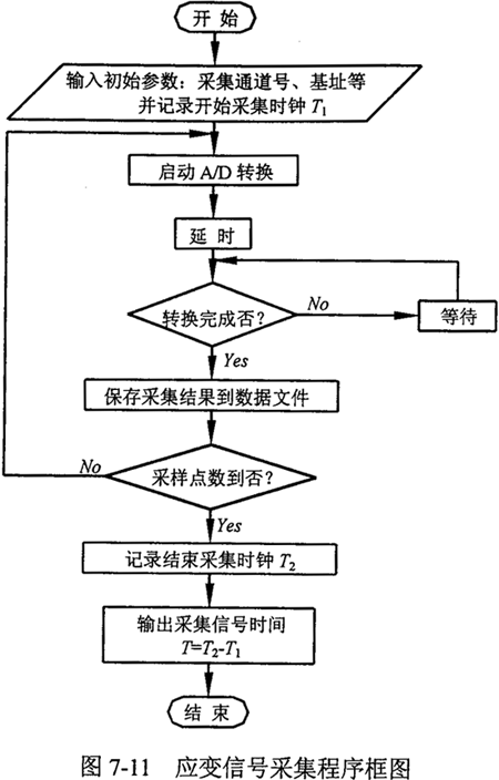 对应于所选用的A/D转换板,编制的应变信号采集程序框图如图7-11所示。