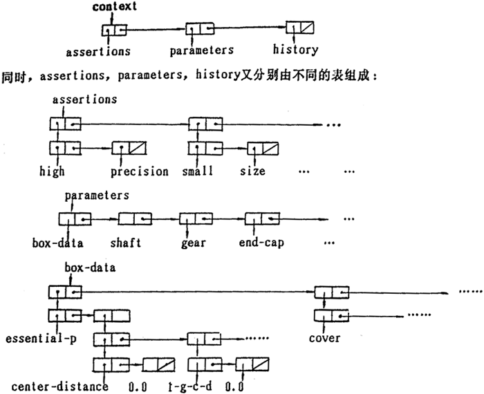 2.上下文的组成:圆柱齿轮减速器设计专家系统的上下文由三部分组成,它们分别是断言表(ASSAERTIONS)、设计参数表(PARA METERAS)和进程表(HlSTORY)。