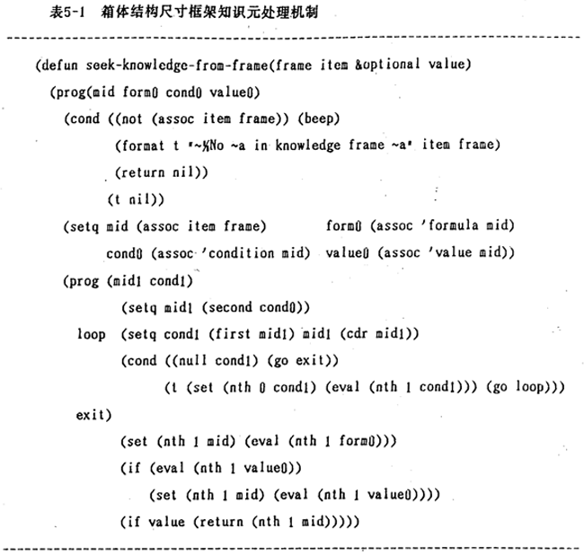 最后,测试取值条件(value)侧面,若对取值有限制,则检验所计算值是否满足红束条件;如对delta值的限制,若delta≤8,则取delta=8。对箱体知识的求值过程的LISP函数如表5-1: