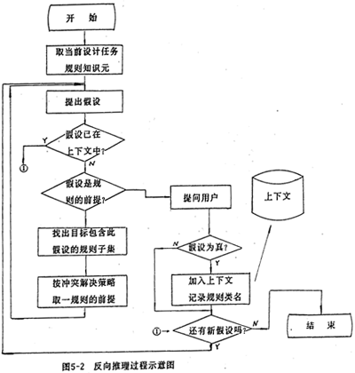 反向推理是一种后向链控制策略(也称为目标驱动控制)。这种控制的基本思想是:预先假设一个目标,然后在知识库中找出那些其结论部分可能导致这个目标为真的规则集,再检查规则集中每条规则的前题部分,如果某条规则的前题中所含有的各条件均能通过用户的会话得到满足,或者能被用户已经提供的上下文的事实所匹配,则把规则的结论部分(即目标)加到上下文中,从而该目标被证明。否则把规则的条件项目作为新的子目标,递归执行上述过程,直到各“与”关系的子目标的全部和“或”关系的子目标中有一个出现在上下文中时,目标被求解,或者直到子目标不能进一步分解而且上下文不能实现上述满足时,这个预先假设的目标失败,系统此时需要重新假设新的目标。
